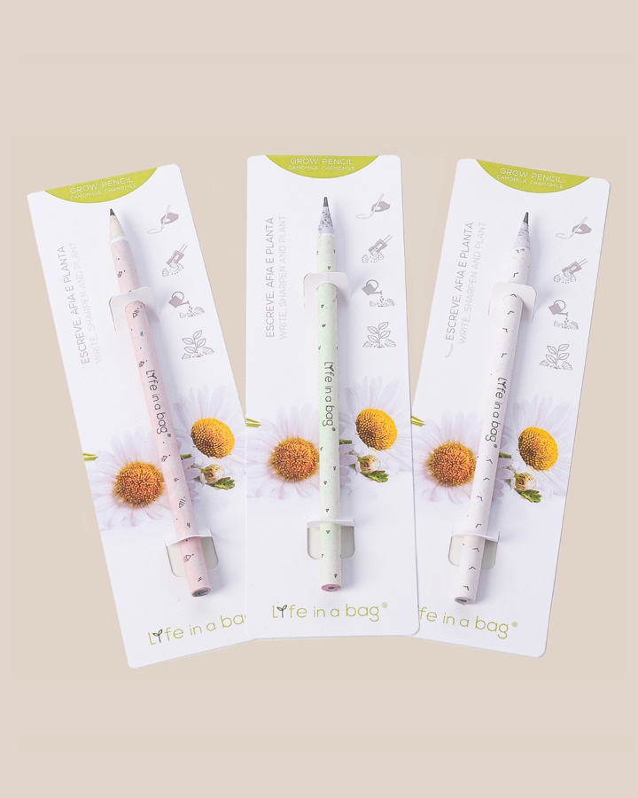 Un conjunto de 3 lápices hechos a partir de papel reciclado con semillas de manzanilla en su interior. Escribir nunca ha sido tan inspirador. Escribe, afila y planta las virutas en lugar de desecharlas, y verás crecer hermosas flores de manzanilla.